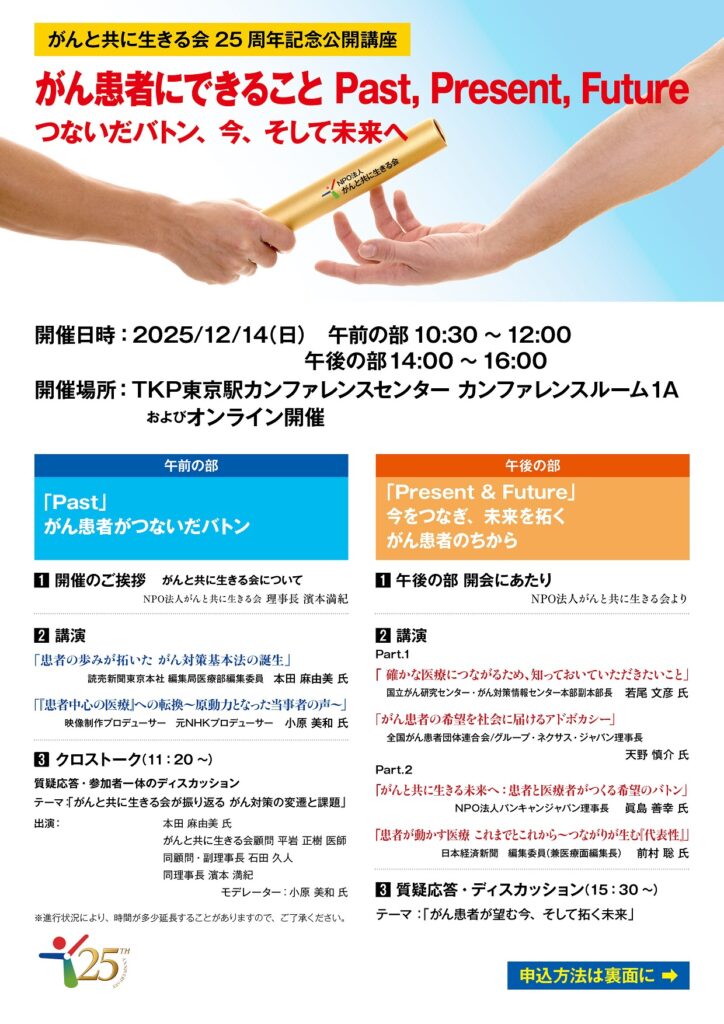 2025年12月14日(日)がんと共に生きる会 25周年記念公開講座「がん患者にできること Past, Present, Future つないだバトン、今、そして未来へ」開催のお知らせ